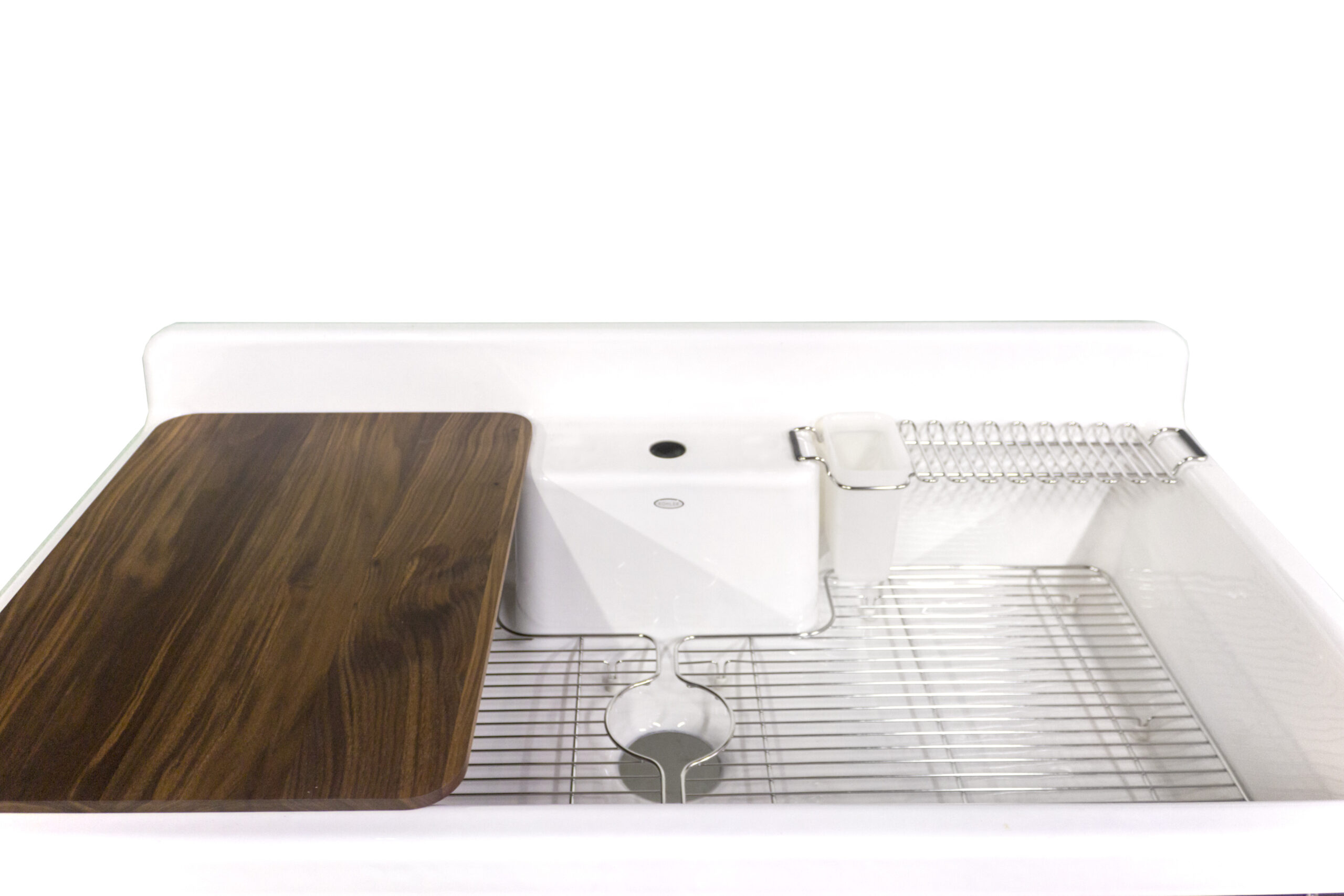 White Kohler Farmstead Sink Package Wall Mount Kitchen Farm Sink Transitional Leg Base (Includes Drain, Faucet, Cutting Board + More)